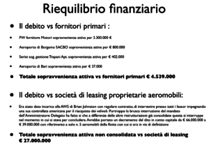 2. Nel 2010 sono stato AD di Itali Airlines, ho ridotto l’indebitamento del 35% portando l’impresa in utile, con la riammissione alle linee creditizie sospese prima del mio arrivo alla compagnia stessa ed al gruppo di cui faceva parte. Completato il torneround, nell’Ottobre 2010 l’intero gruppo di cui Itali Airlines faceva parte venne posto sotto sequestro dalla magistratura per una indagine giudiziaria che coinvolse l’azionista di maggioranza e numerosi manager. Il sottoscritto era totalmente estraneo all’indagine, a seguito di tutto ciò lasciai la compagnia.